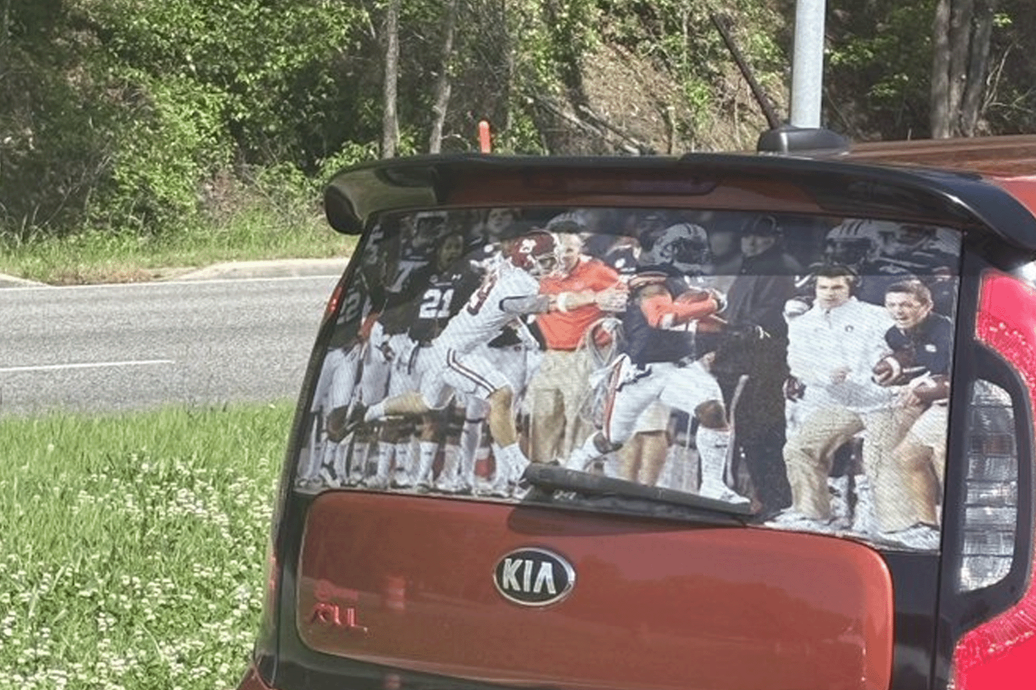 This Auburn fan had their back windshield covered with an image of Zakoby McClain’s 100-yard pick-six on Alabama QB Mac Jones.