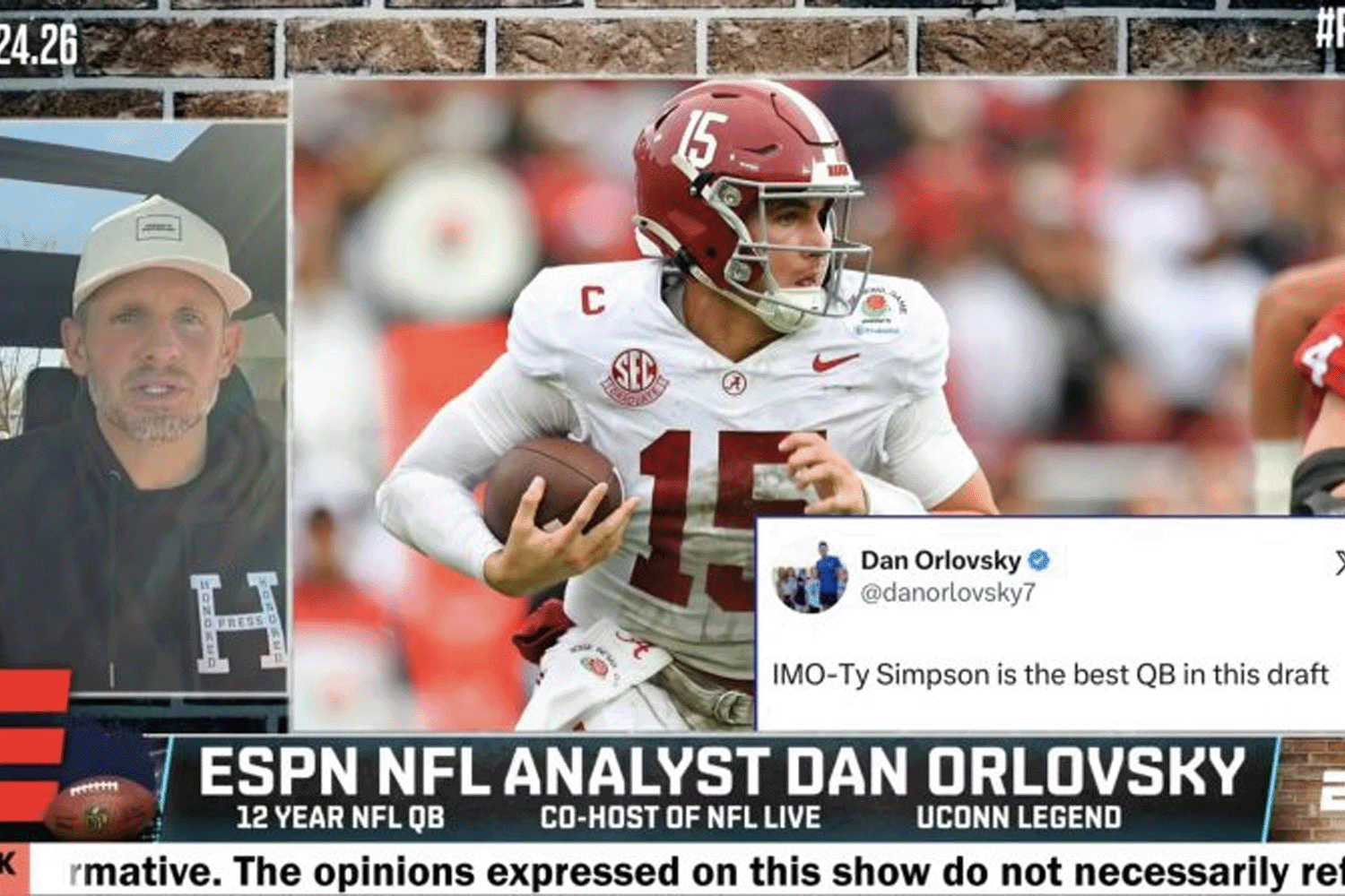 After claiming on multiple shows that Ty Simpson was “QB1” of the draft over Fernando Mendoza (he’s not), Orlovsky continued to double down on his take that Simpson was “the” guy in the draft.