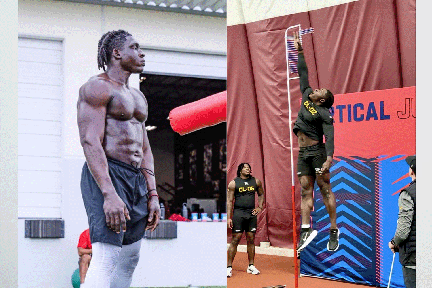 This guys is an athletic freak. He’s 6’4.5”, runs a 4.65 40, hits 31 bench reps, 39 in vertical, 35 in arms, and at 306lbs has 6% body fat.